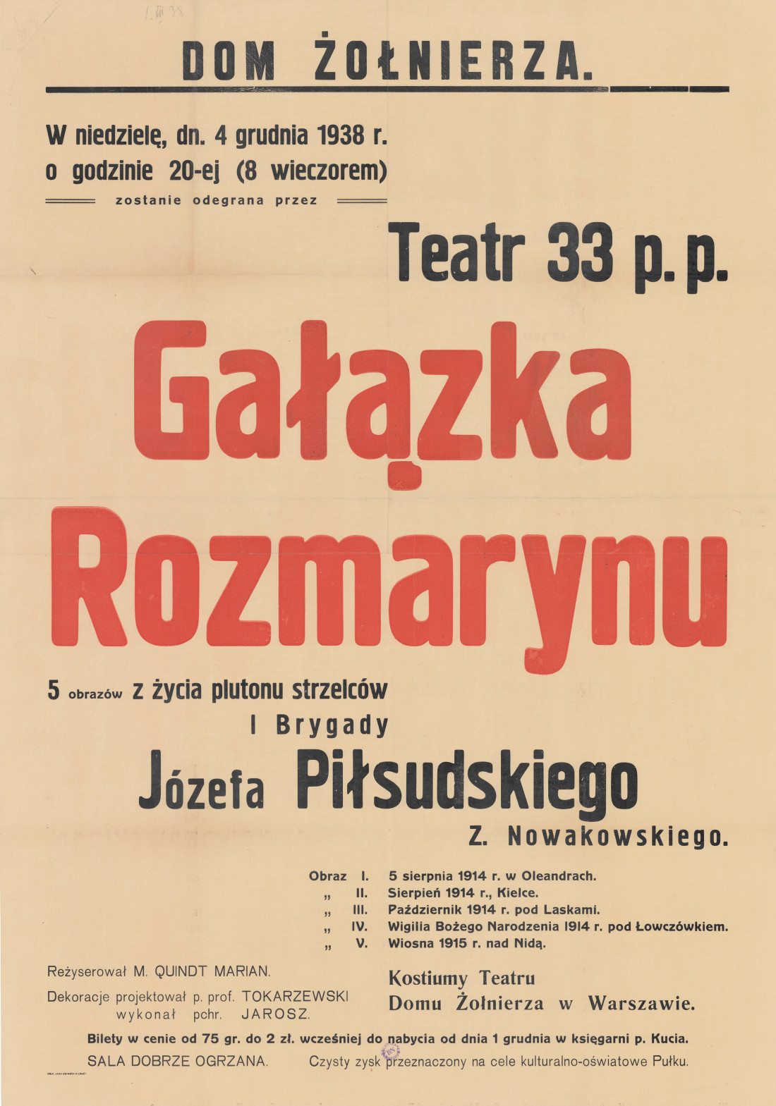 Odcedziwszy patos i górnolotne frazy (po 1945 roku twórczo rozwinięte przez propagandę komunistyczną) warto spojrzeć na Gałązkę rozmarynu jako na element programu rozszerzenia, by nie rzec „umasowienia” teatru, a poprzez niego budowania świadomości narodowej i wzmacniania „niepodległości z ducha”. Warto też zauważyć, że ów „Teatr Polski żywej” wydaje się być bliski idei Teatru Społecznego, nad którą pracował Juliusz Osterwa pod koniec lat trzydziestych i w czasie okupacji10. Dodatkowo sam Nowakowski zdawał się sugerować, że napisał sztukę wbrew ówczesnym elitom intelektualnym. W felietonie opublikowanym po warszawskiej prapremierze Gałązki… na łamach „Ilustrowanego Kuriera Codziennego” (popularnego „IKaCa”, niecieszącego się dobrą opinią wśród przedwojennej inteligencji) pisał: