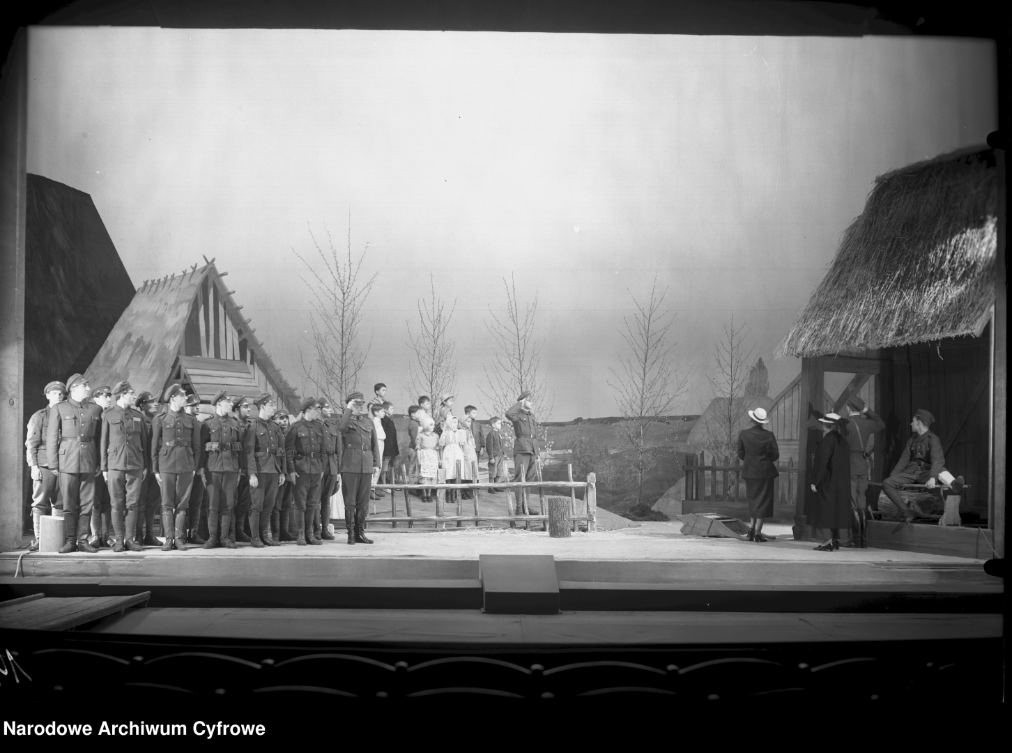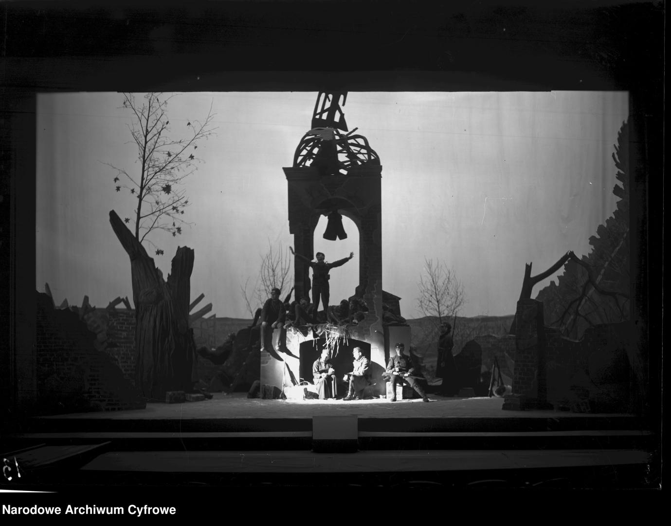 Nowakowski posłużył się przy pisaniu Gałązki rozmarynu rozwiązaniami charakterystycznymi zarówno dla polskiego historycznego dramatu popularnego3, jak i melodramatu4, reportażu scenicznego5 czy nawet sowieckich sztuk propagandowych6. Powstał w ten sposób amalgamat, w którym elementy teatru dokumentalnego (autentyczne miejsca i wydarzenia) mieszają się z tradycyjnymi schematami dramaturgicznymi (miłosny trójkąt, przebieranka, demaskacja). Zostawię na boku spór o to, czy rzeczywistość wojny została w tej sztuce wiernie oddana (a opinie w tej sprawie są mocno podzielone – od zdania, że „niewiele w tym obrazie wojny autentyzmu”7 po zestawienie Gałązki… z Na zachodzie bez zmian Ericha Marii Remarque’a8) i przyjrzę się kontekstowi, w jakim sztuka ta powstała.