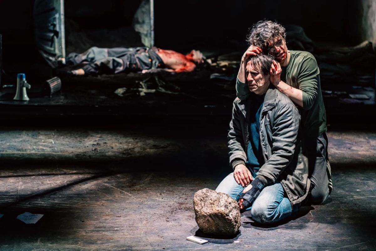 W obu spektaklach ukraińskie doświadczenie posłużyło jako element budowania narracji skierowanej do kogoś innego, do polskiej wspólnoty. Englert na odchodne chciał w Hamlecie powiedzieć o kilku rzeczach na raz: o bezwzględności walki pokoleniowej, o naiwności młodych ludzi i cynizmie starszych, a imperialna Rosja objawiała się niespodziewanie i trochę na doczepkę. Ten prosty chwyt aktualizacyjny nie miał zbyt wiele wspólnego z dążącym do uniwersalizacji tonem całego przedstawienia. Natomiast Klata sięgnął po najnowszą wizualną kliszę, stworzył scenę, odwołującą się do setek coraz to nowych filmików wrzucanych do internetu przez obie strony walki na Ukrainie. Sama ich publikacja – za milczącą zgodą cenzury wojennej – jest elementem tej wojny. Często widać na nich moment tuż przed śmiercią, strach, przerażenie, rezygnację żołnierza ściganego jak zwierzę, w sytuacji ostatecznej próby. Czasem możemy nawet spojrzeć mu prosto w twarz, zanim nastąpi eksplozja, a obraz pokryją szare, migoczące piksele.