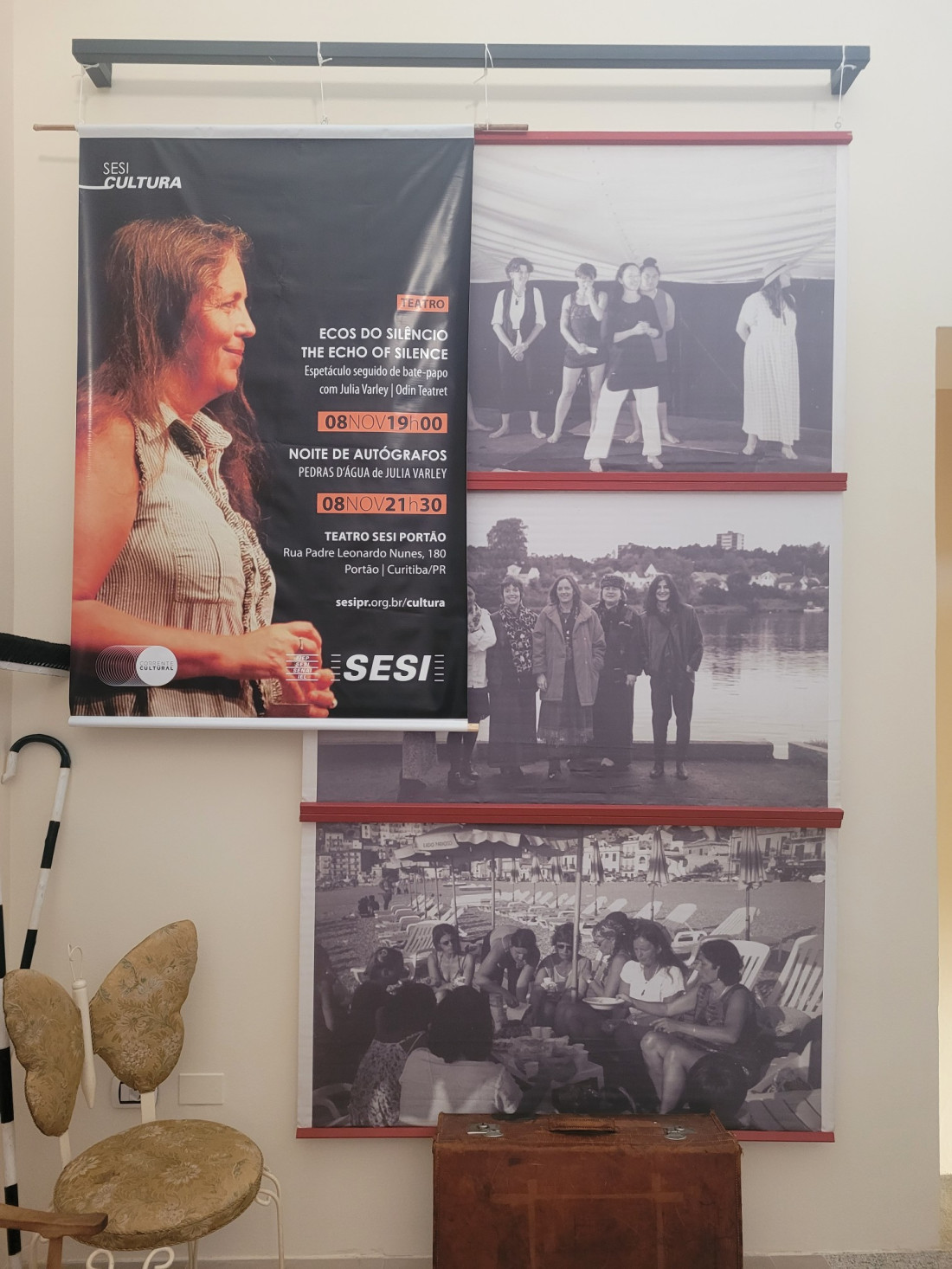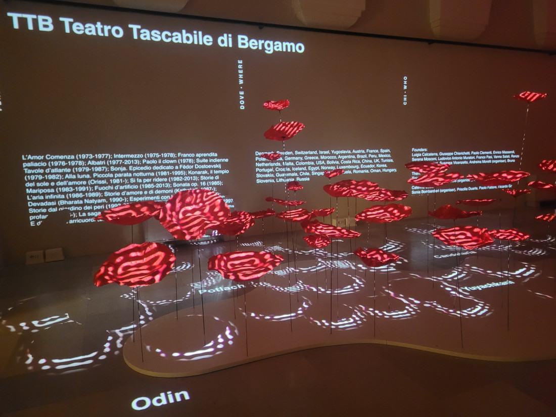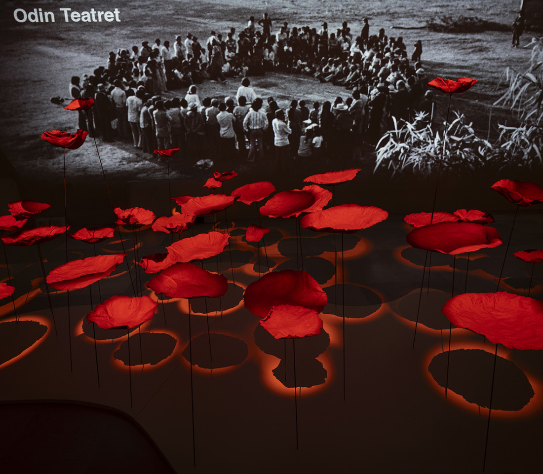 Sala poświęcona Odin Teatret. Plakaty z przedstawień, instalacje z obiektów ze spektakli, fragmenty nagrań na ekranach zawieszonych na ścianie.